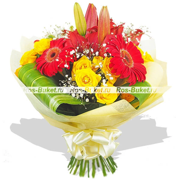 Стандартный (на фото): лилия красная - 2 шт, гербера красная - 2 шт, роза кустовая желтая - 3 шт, гипсофила - 3 шт, лист аспидистры загнутый - 4 шт, фетр светный.